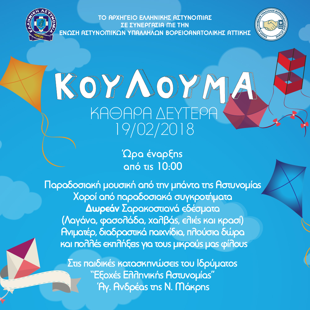Η Ένωση Αστυνομικών Υπαλλήλων Βορειοανατολικής Αττικής διοργανώνει για πρώτη φορά παραδοσιακή εκδήλωση, ΚΟΥΛΟΥΜΑ 2018 την Καθαρά Δευτέρα 19 Φεβρουαρίου 2018